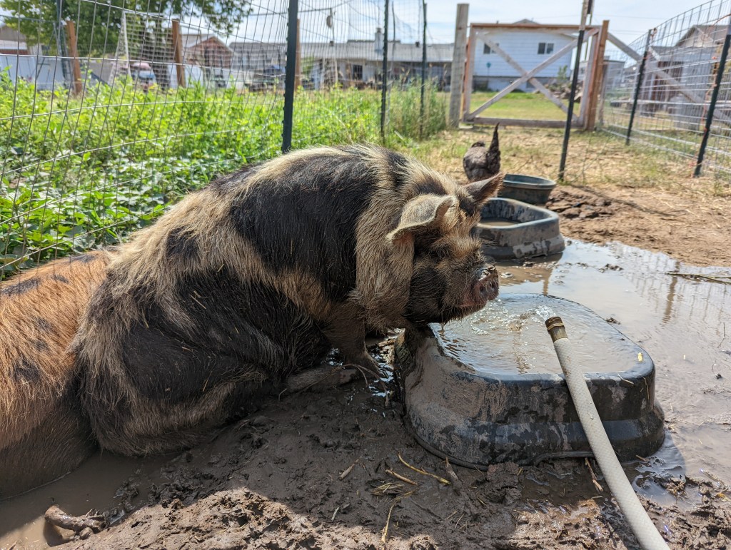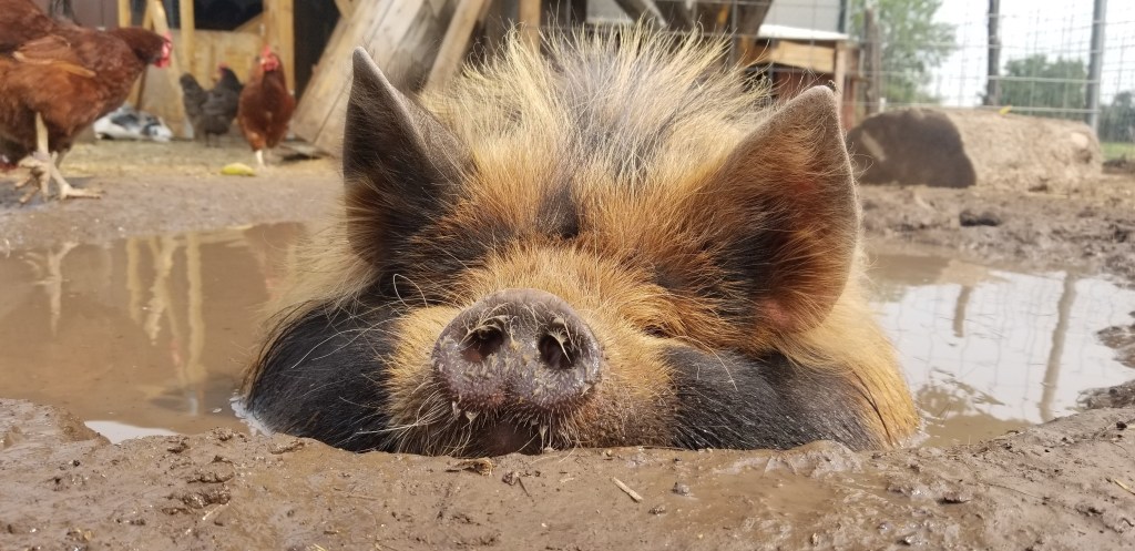 This is Boss. He is our stud Kune Kune Pig. He is very sweet and loves to cuddle with any thing or anyone. We have Kune Kune pigs because they produce good meat and are smaller and less aggressive them other hogs. They are a true grazing pig and at times we have had them on a all grass diet feeding them cereal rye we grow. Through this winter we have provided them with pellet food to give them the needed nutrients they need to stay warm in the harsh winter.